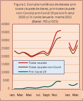 Evoluția numărului de decese pe luni în anul 2020 și în primele trei luni din anul 2021 prin toate cauzele de deces, prin Covid-19 și prin toate celelalte cauze non-Covid este cea din figura 1. Se poate distinge, pe de o parte, numărul mic de decese prin coronavirus în ansamblul mortalității populației țării și, pe de altă parte, o creștere mult mai importantă a deceselor prin alte cauze în lunile de ascensiune majoră a deceselor prin Covid-19, lunile octombrie, noiembrie și decembrie. Examinând dinamica la nivel de grupe mari de cauze de deces putem vedea și unde au avut loc creșteri importante ale numărului de decese în anul 2020: la decesele prin boli le aparatului circulator și la decesele prin alte boli ale aparatului respirator decât prin noul virus. Explicația recrudescenței deceselor prin aceste cauze o găsim, doar într-o anumită măsură, în opiniile specialiștilor.