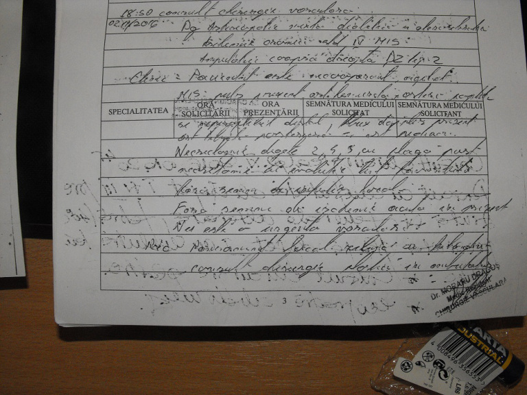 Astfel că l-a trimis pe pacient la secția de chirurgie cardiovasculară din Județean pentru ca medicul de gardă de acolo – un medic rezident – să constate și el că infecția de care suferea pacientul era cauzată de degetele amputate. Numai că…, surpriză! Medicul specialist a scris în foaia de observație că nu există nicio urmă de infecție la degetele respective și a returnat pacientul către Urgență. Cu o singură greșeală: în loc de degetele amputate 1 și 3, a trecut trei degete – 2,4,5. Total fals, domnule medic rezident incapabil Dragoș Moraru!!!