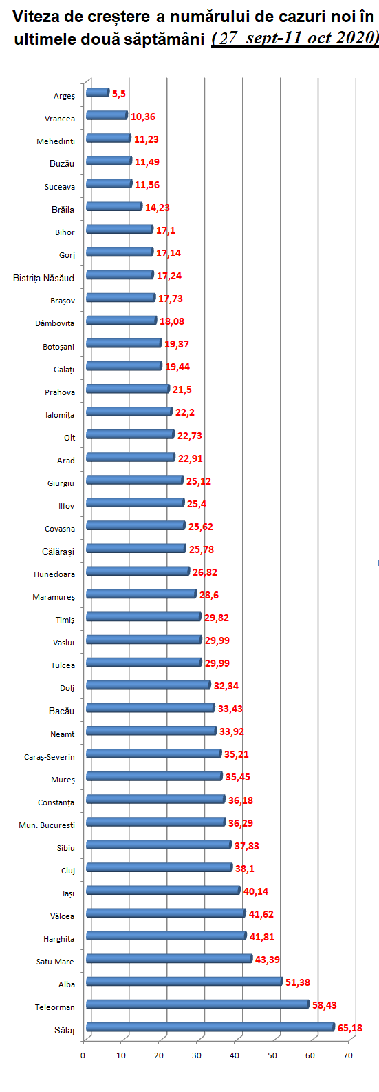 Potrivit datelor transmise de Grupul de Comunicare Strategică agregate ulterior de HotNews.ro, cea mai mare viteză de răspândire a virusului în ultimele două săptămâni a fost în județul Sălaj, unde numărul de infecții a crescut cu peste 65% în intervalul 27 septembrie-11 octombrie 2020. Creșteri de peste 50% au mai fost înregistrate în Teleorman (58,4%) și Alba (51,3%). La polul opus se află județul Argeș, cu o creștere a infecțiilor noi de puțin peste 5% și Vrancea, cu puțin peste 10%.