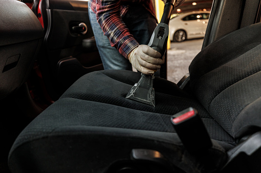 Professional cleaner deep washing passenger seat with special vacuum-cleaner.