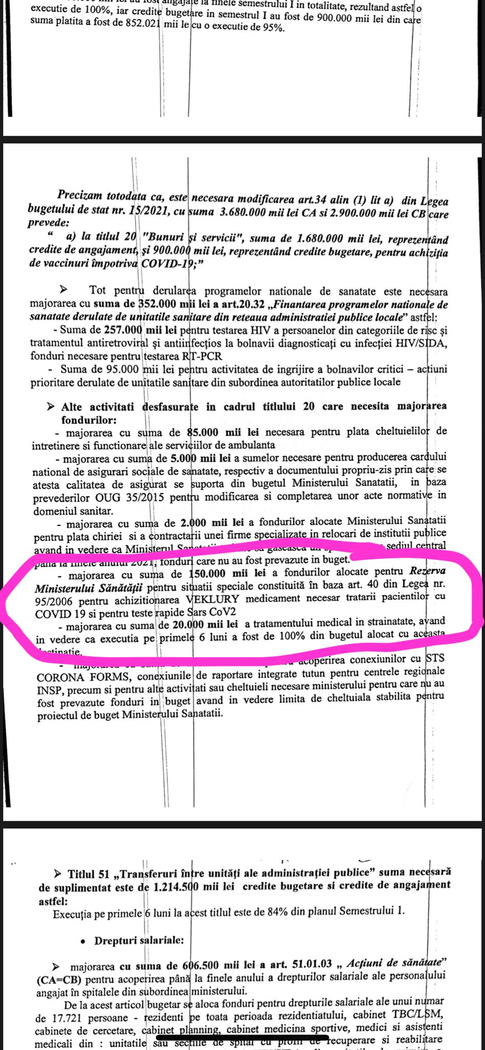 • De cealaltă parte, fostul ministru al Sănătății, Ioana Mihăilă, a declarat pentru HotNews.ro că banii pentru achiziția de medicamente în general, nu doar pentru COVID, au fost o problemă pe întreg parcursul mandatului său de ministru, iar banii pentru achiziția de medicamente pentru valul 4 au venit abia după rectificarea bugetară, adică după ce mandatul său de ministru se încheiase deja.