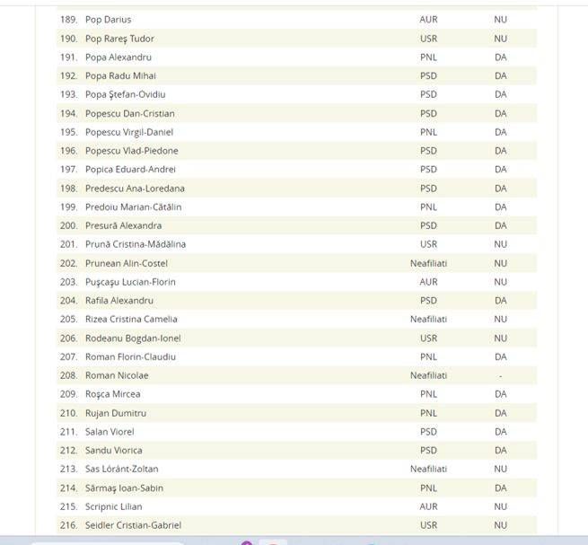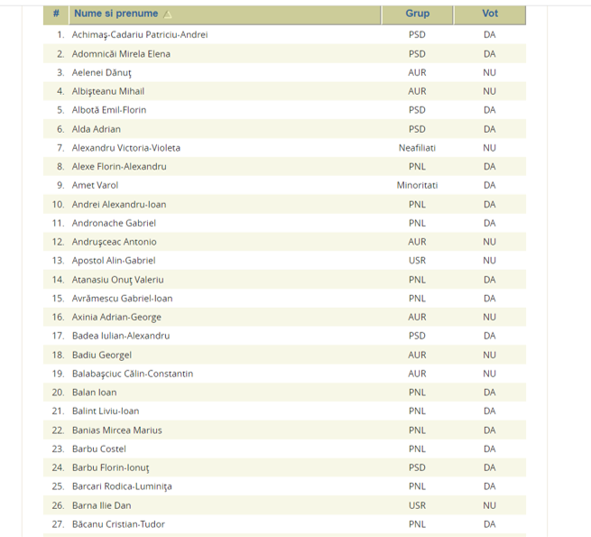 - parlamentarii AUR, 24 prezenți și toți 24 au votat ÎMPOTRIVĂ și nu am descoperit deocamdată vreun mesaj public din care să lămurească gestul lor. Spun surse din mijlocul lor că votul lor ar fi în legătură cu îngrijorarea față de sistemul de ordine și siguranță publică, ar fi utilă exprimarea publică a poziției în acest sens.