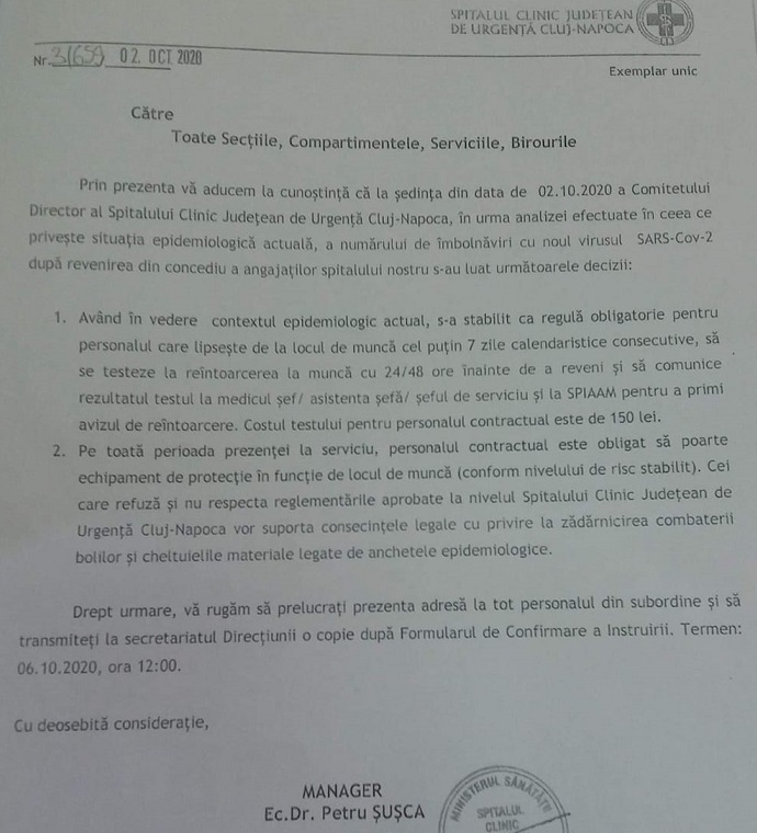 Domnule ministru Tătaru, prin adresa 31659 din 2 octombrie, transmisă de către managerul Spitalului Județean Cluj, Petru Șușca, în atenția personalului medico-sanitar din acest spital, acesta atrăgea atenția angajaților că sunt obligați să se testeze anti Covid 19 cu un test efectuat cu 24/48 de ore înainte de întoarcerea în spital, dacă angajatul a lipsit de la locul de muncă mai mult de 7 zile consecutiv. Mai mult decât atât, în aceeași adresă managerul Șușca indica faptul că angajații trebuie să-și plătească acest test și că ar costa 150 de lei.