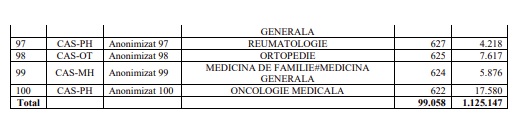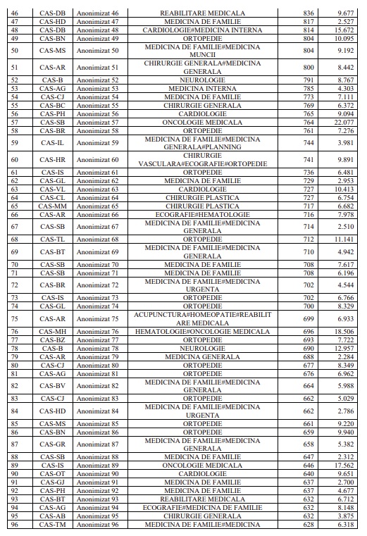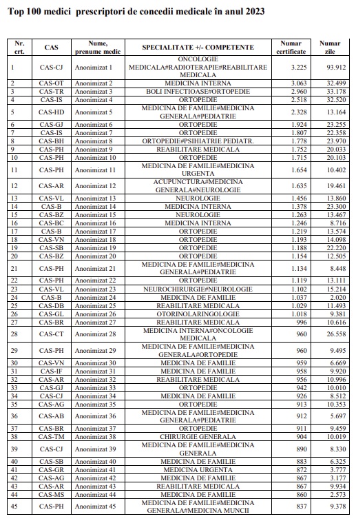 Top 100 al medicilor (pe specialități medicale) care au eliberat cele mai multe certificate de concediu medical în anul 2023 – sursa: Casa Națională de Asigurări de Sănătate: