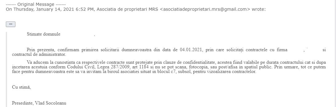 Ba chiar până să realizeze că mai bine face pe mortul în păpușoi și uită că suferă de analfabetism funcțional, răspunde la unul intre e-mailurile solicitate dovedindu-și lipsa de minime studii juridice precizând despre confidențialitatea contractelor(legea îl obliga să le afișeze la avizier) și precizează un art. 1184, găsit pe net, fără îndoială ce se referă la obligația de confidențialitate în negocierile precontractuale. Unde dai și unde crapă…