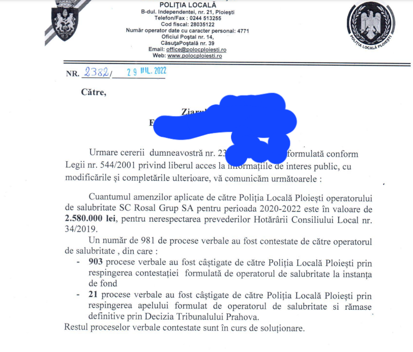 Astfel, in perioada 01.01.2020 – 01.01.2021, Politia Locala Ploiesti a aplicat un numar 53 de sanctiuni operatorului de salubritate mentionat, in valoare de 132.500 lei (conform adresei 2407/03.08.2022, atasata).