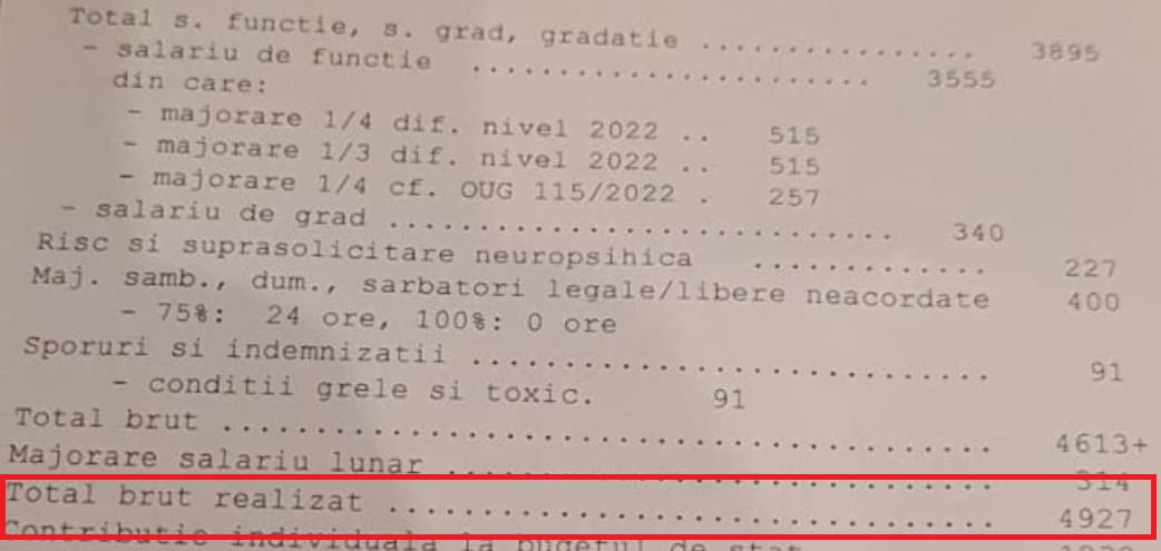 Aceasta este valoarea brută a salariului unui agent de poliție cu 4 ani vechime, iar 33% din aceasta sumă care nu va fi supusă impozitului și contribuțiilor e de 1642 lei.