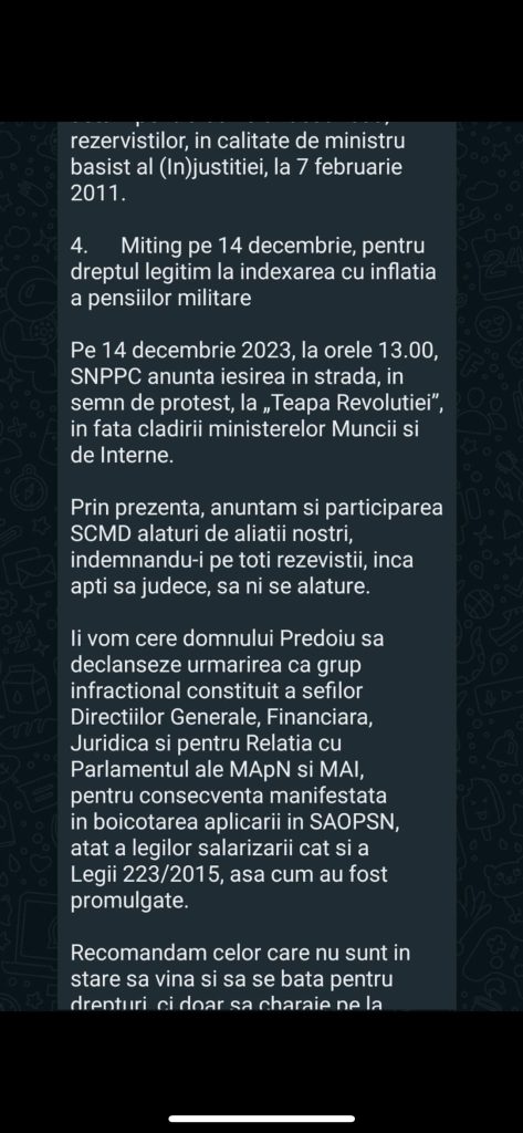 Acum, pe principiul parafrazat al Academiei Cațavencu după care ”membrii sindicatului nostru sunt mai deștepți decât ai lor”, țin să spun că tocmai un asemenea scenariu ne-a adus aici. Ne-a adus aici, faptul că mai mereu, majoritatea polițiștilor a așteptat să lupte alții pentru drepturi, alții să iasă în stradă. Pe când mobilizam lumea la proteste, nu de puține ori întâlneam inși cu atitudine superioară, afundați – tocmai atunci – în treburi mult mai importante! Pentru că suntem urmăriți de militari – primesc multe semnale de apreciere legate de ceea ce scriem – unde sunt mulțimile de pensionari militari, atunci când polițiștii ies în stradă, se mai intreaba acesta?