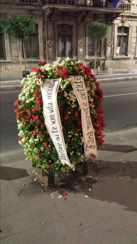 De asemenea, acest lucru a fost organizat „ca la carte” deoarece,pe pagina de Facebook a grupului intitulat Rezistenta urbană, a fost publicată şi imaginea cu „coroana funerară“. Concret, pe aranjamentul floral au fost puse panglici pe care scrie: „Doctore, nu te vom uita niciodată!“