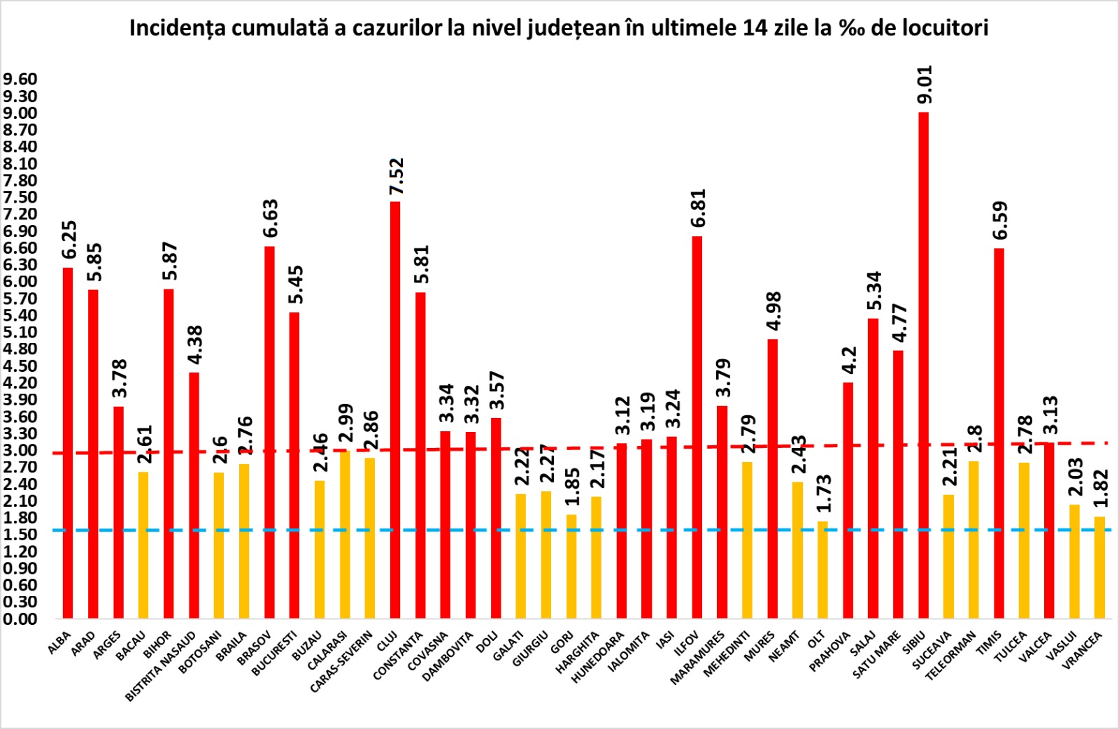 23 de județe și municipiul București au o rată de infectare de peste 3 cazuri de COVID-19 la mia de locuitori, cel mai mare indice fiind la Sibiu(9,01), potrivit datelor publicate miercuri de Grupul de Comunicare Strategică. În top urmează Clujul cu 7,52 în ușoară creștere față de ziua precedentă(7,42). În București, se inregistrează o ușoară scădere, miercuri fiind raportat un indice la 14 zile de 5,45, fată de 5,54 marți.