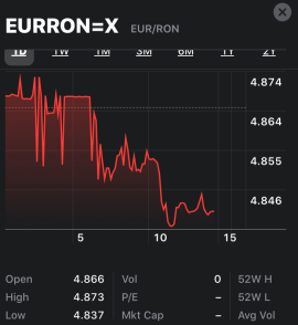 4. O soluție rațională pentru ca BNR să limiteze volatilitatea pe curs ar fi fost plafonarea comisioanelor pentru cursul de schimb la niveluri rezonabile (zero virgulă ceva, nu 4%). Dar BNR doarme și oferă cursuri bune celor care ies din economie, în condiții anunțate de instabilitate financiară și evident de depreciere iminentă a leului. Și aici este prima dată pentru care Consiliul Concurenței trebuie să se sesizeze, să vadă dacă băncile nu s-au înțeles la nivelul comisionelor aplicate pentru vânzarea/cumpărarea de Euro. Două bănci mari din sistem, indiferent de ce se întâmpla pe piața valutară, ofereau același curs de cumpărare: 4,92 lei pentru un Euro.