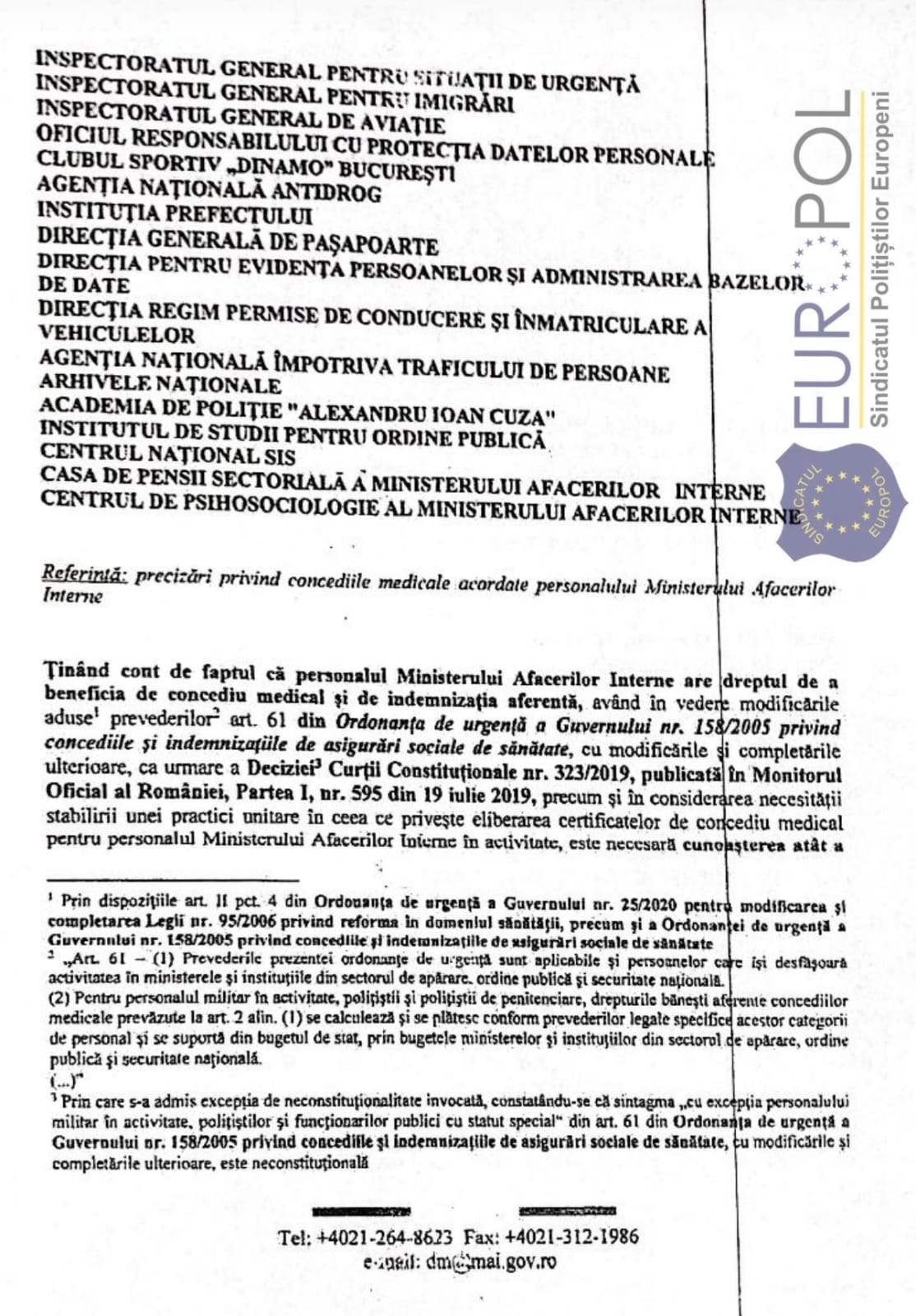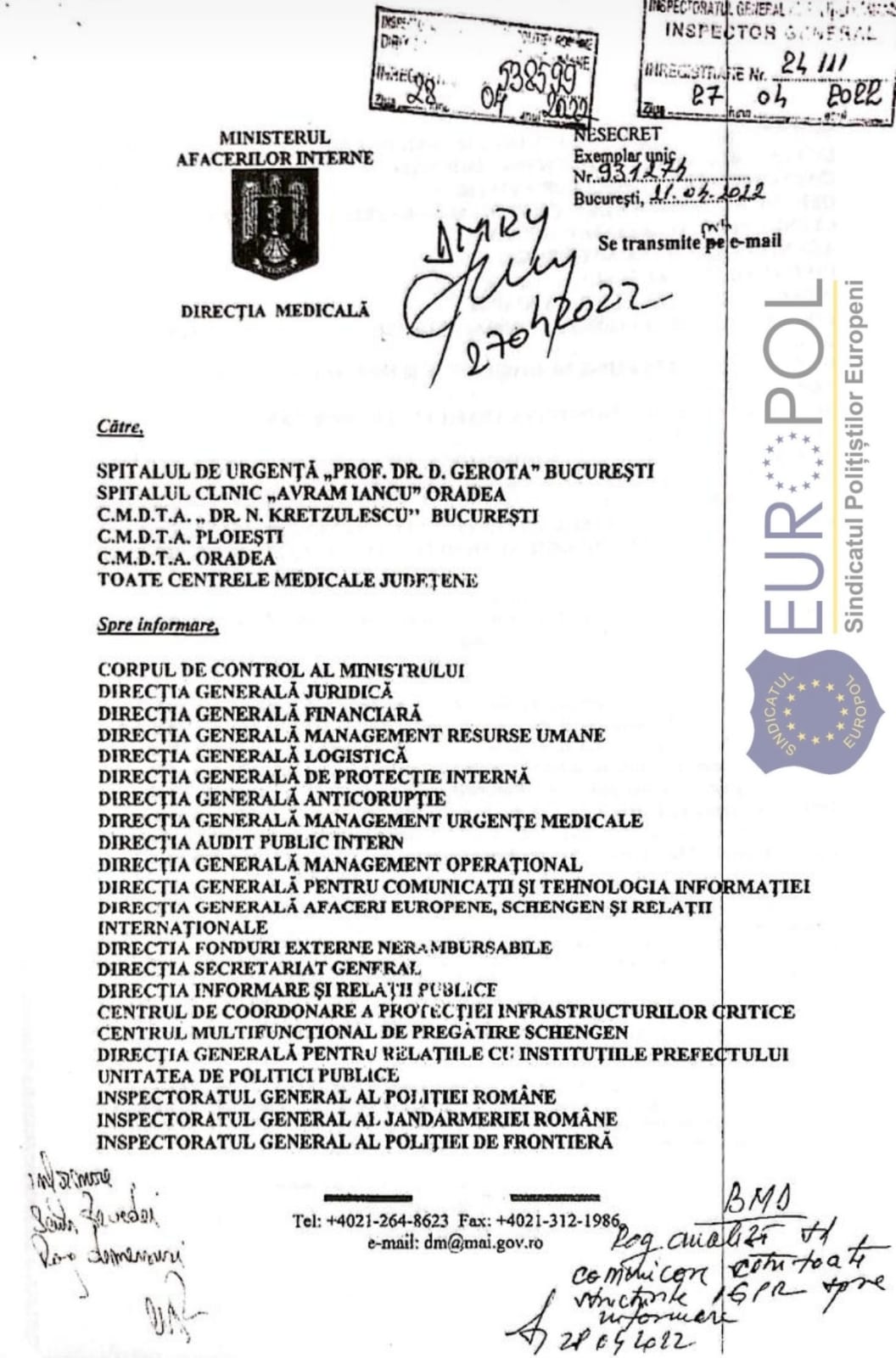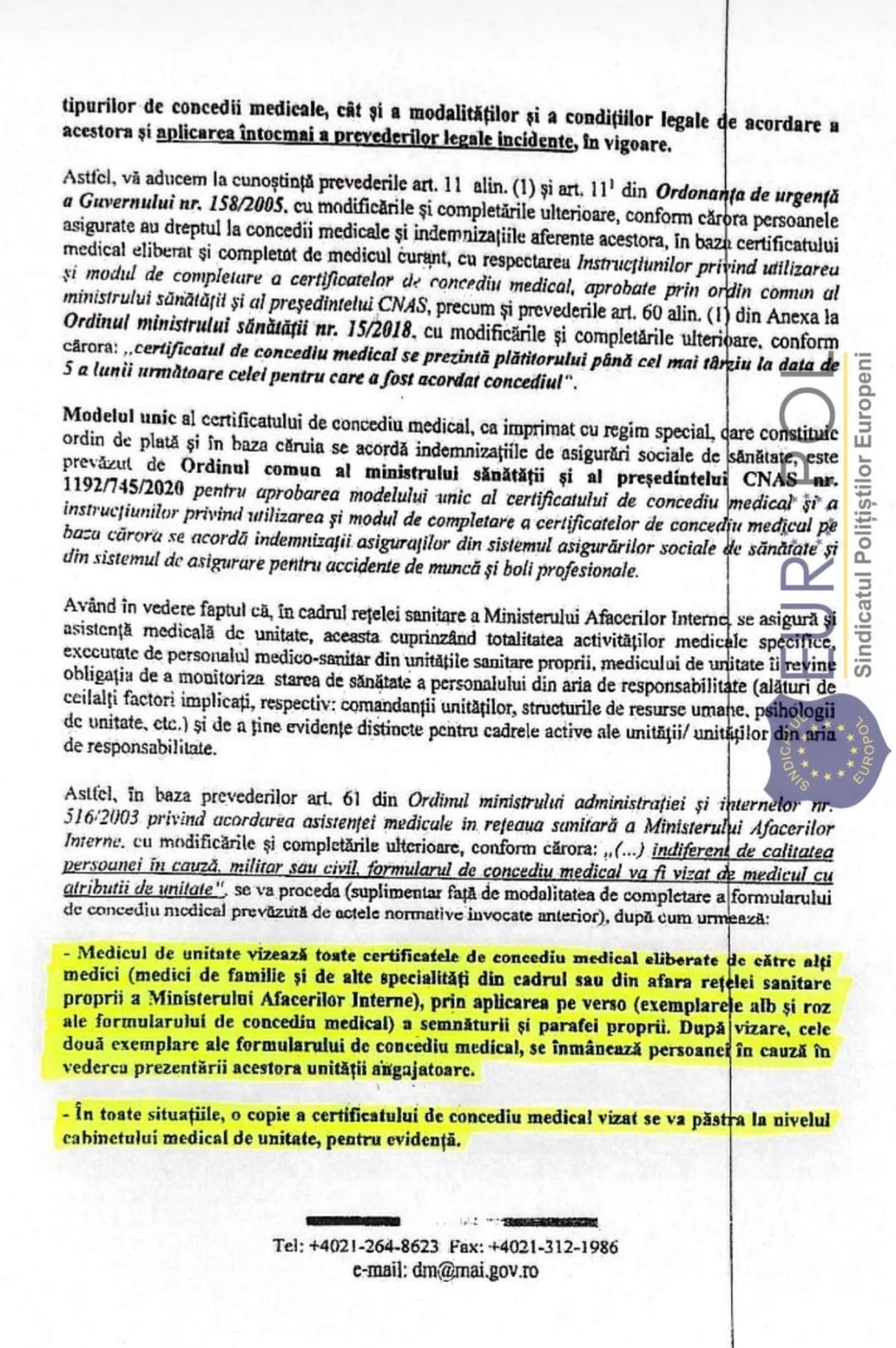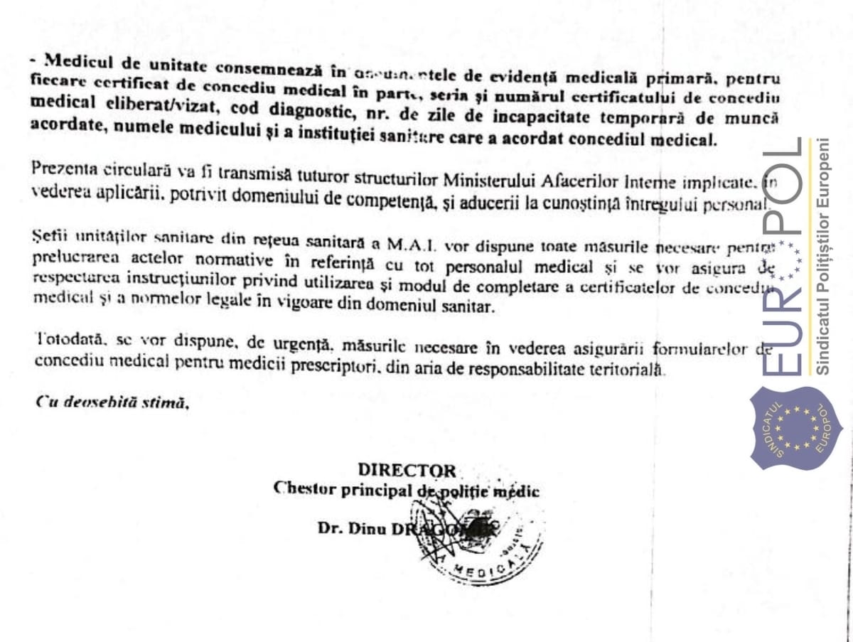 Astfel, conform adresei cu nr. 931274/21.04.2022, Direcția Medicală a transmis tuturor unităților subordonate MAI precizări referitoare la modalitatea în care certificatele de concediu medical vor fi vizate, după cum urmează: