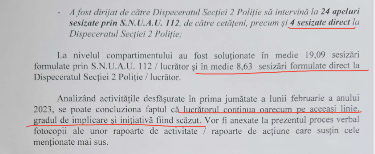 Următoarea critică, este de-a dreptul halucinantă și se referă la faptul că agentul în cauză a intervenit doar la 4 cazuri sesizate direct prin dispeceratul unității, în comparație cu colegii lui care au intervenit la 8,63 sesizări. Atenție, pentru ca toți cei care citesc aceste rânduri să înțeleagă despre ce este vorba, cei doi ofițeri îi reproșează agentului că pe durata serviciului său, nu au sunat mai mulți cetățeni la dispeceratul secției să sesizeze diverse. Păi în logica aceasta, îl vom îndruma pe polițist să îi roage pe apropiați/prieteni ca atunci când intră el în serviciu aceștia să sune la Poliție și să reclame fel de fel de fapte, pentru a se ridica și el la norma impusă de 8,63 intervenții.
