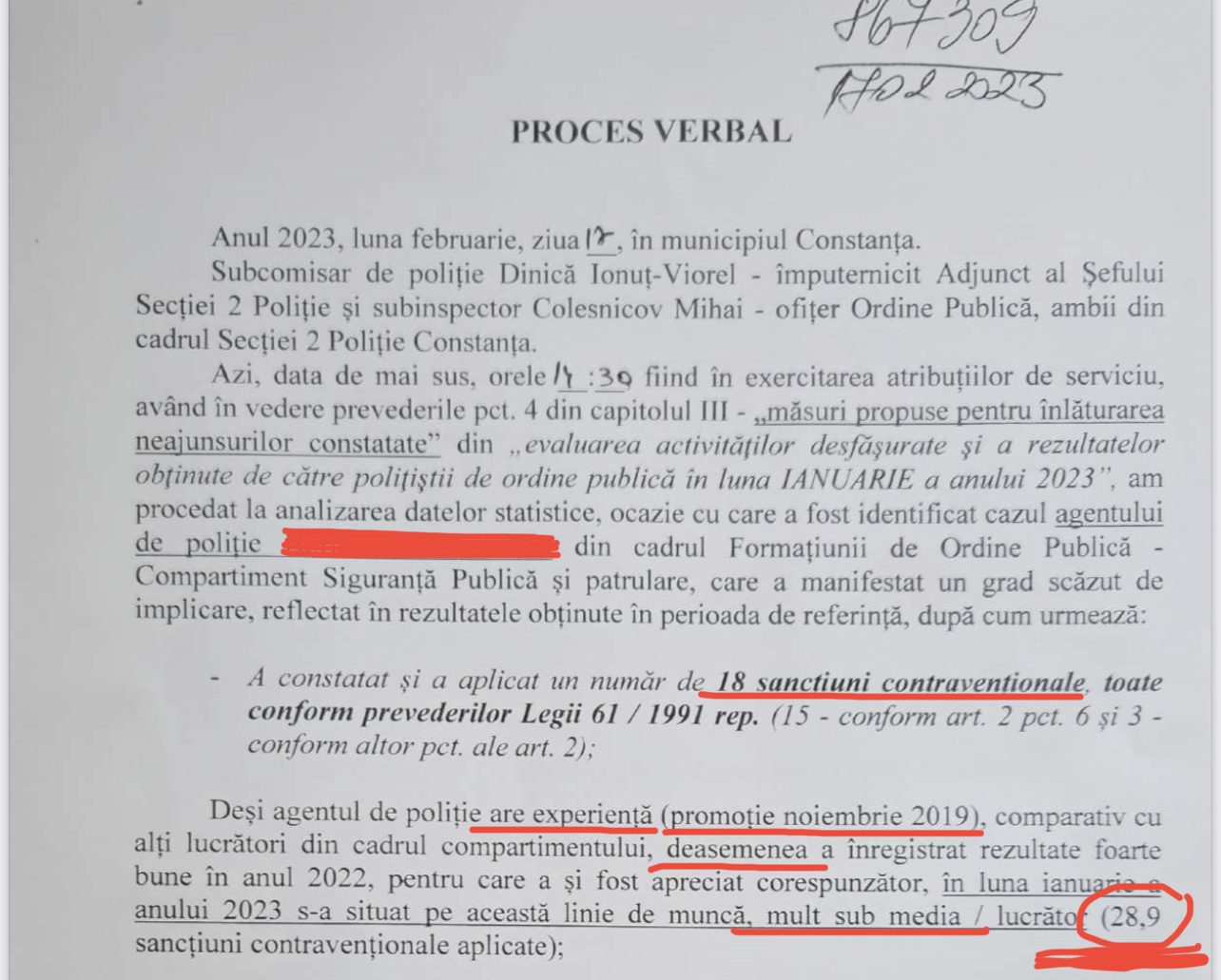 Astăzi vă prezentăm un caz de la Constanța, unde căprăria și norma de amenzi a fost dusă la rang de „procedură”. Astfel, polițistul din stradă este chemat singur în fața șefului de birou ordine publică și a adjunctului șefului de secție, care evident este un „împuternicit”, i se prezintă niște cifre din care rezultă că e „nasol”. I se reproșează că nu a produs suficiente amenzi sau că nu a avut suficiente intervenții inducându-i-se în mod direct că trebuie să „vâneze” mai mulți cetățeni, după care i se pune în față un proces-verbal unde semnează că a luat la cunoștință, și că data viitoare se lasă cu sancțiune.