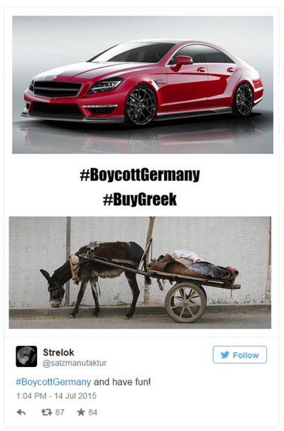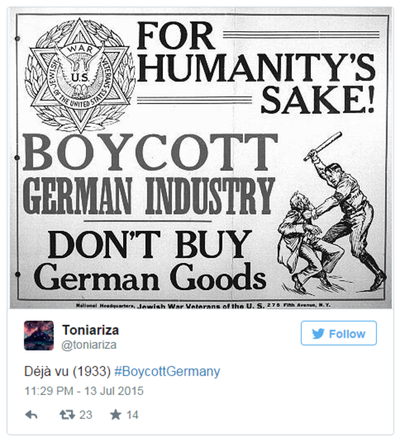 Supăraţi pe reformele drastice cerute de creditori în cazul Greciei, zeci de mii de utilizatori Twitter au folosit hashtagul #BoycottGermany, postând şi fotografii cu produse nemţeşti de evitat. Mai mult, ei au recomandat utilizatorilor să verifice şi codul de bare al produselor tot pentru a le evita pe cele de provenienţă germană.