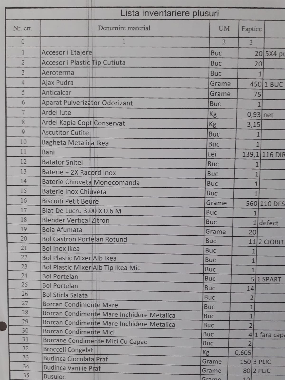 ,,Comisia a inventariat totalitatea bunurilor, elementelor de activ existente în spațiile alocate acestei gestiuni, respectiv: biroul reponsabilului popotă, sala de mese, spațiul de preparare a hranei, camera 1 depozit (beci), camera 2 (beci).”
