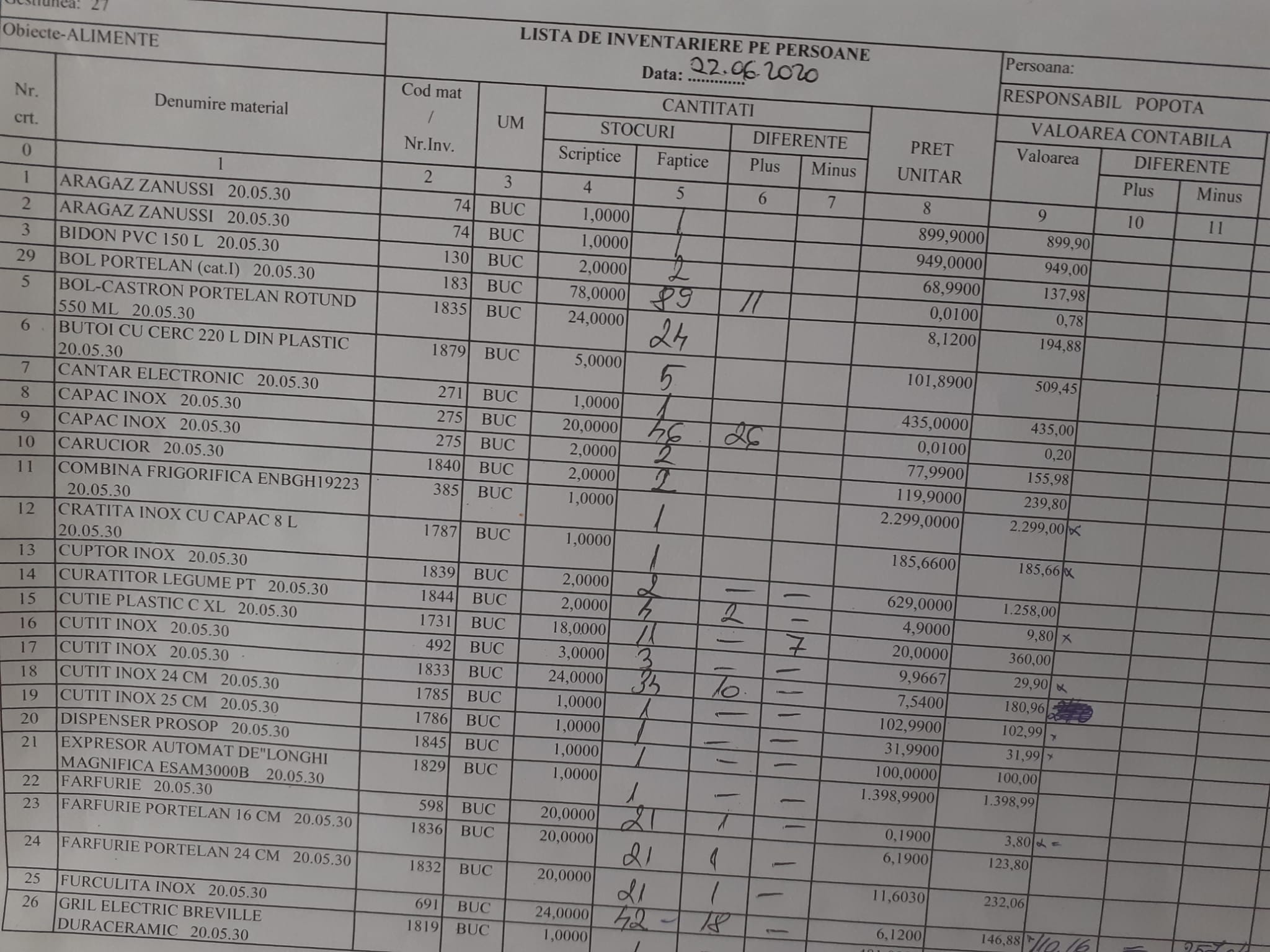 Din Listele de inventariere II la nr.crt 13 sunt trecute Furculițe – 10 buc la preț de 1,69 lei achizitionate în data 16.12.2013 și care sunt depreciate și scoase din folosință la data 02.06.2020- conform Tabel Casare.