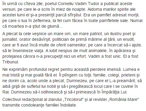 Conform declaratiilor sotiei sale, care i-a fost alaturi o viata intreaga, domnul Vadim si-ar fi simtit sfarsitul. Cand au mers impreuna la spital, pentru ca i se facuse rau, Corneliu Vadim Tudor i-a spus ca este „ultima lui zi”. Acesta a postat pe reteaua de socializare Facebook, o poezie cutremuratoare, ce parca ii prevestea sfarsitul: