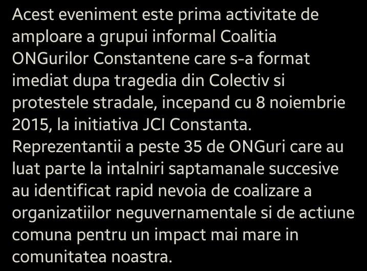 JCI,Maritimo Shopping Center,ONG-uri constănţene numărate şi „alese”pe sprânceană…O nebunie va fi!Prezenţa iluştrilor domni din administraţie şi nu numai…Un EVENIMENT DE NERATAT! Grăbiţi-vă!Locurile sunt limitate!Nu de alta, dar şi cei trecuţi la Domnul din tragedia de la #Colectiv merită cinstiţi într un fel…Nevoia de a epata , de a comunica şi de a strânge rândurile la această şuetă mi se pare CEL MAI INDICAT PRILEJ de a coaliza şi de a uniformiza….societatea civilă obedientă şi umil(it)ă!