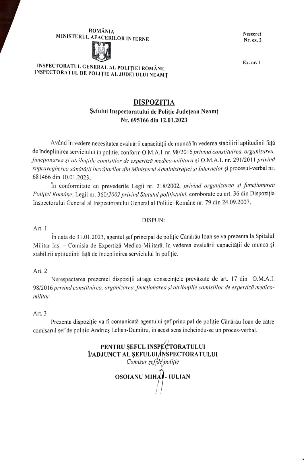 Crezând că va lua concursul și că va căpăta puteri depline, nefiind îndestulătoare, pentru orgoliul lui de șef, sancțiunile disciplinare abuzive și mutarea cât se poate de ilegală a liderului de sindicat Europol Neamt, a apăsat pedala mai tare arogându-și priceperi și puteri medicale, dispunând, printr-o ultimă zvâcnire, împuternicire neuronală managerială, obligativitatea prezentării polițistului incomod în fața unei comisii medicale, cu intenția necontestabilă, sinceră, vădită de a-i face bine polițistului, de a-l ajuta, nicidecum de a fi declarat inapt medical, Doamne ferește!