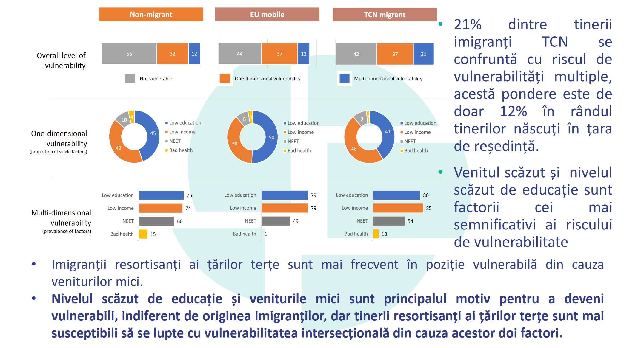 Diferențe mai importante apar în ceea ce privește integrarea lor în societate. De exemplu, dacă ne uităm la rata sărăciei, vedem că aproape 40 la sută dintre tinerii imigranți sunt expuși unui risc de sărăcie – aproape dublu față de tinerii nativi. La condițiile de locuit situația este de asemenea mult diferită între cele două categorii; imigranții au o situație mult mai grea trăiesc în gospodării supra aglomerate sau în gospodării cu intensitate redusă a muncii și de asemenea au o deprivare materială severă dublă față de nativi. Există, trebuie să recunoaștem, diferențe semnificative între țările Europei, adaugă prof. Roman.