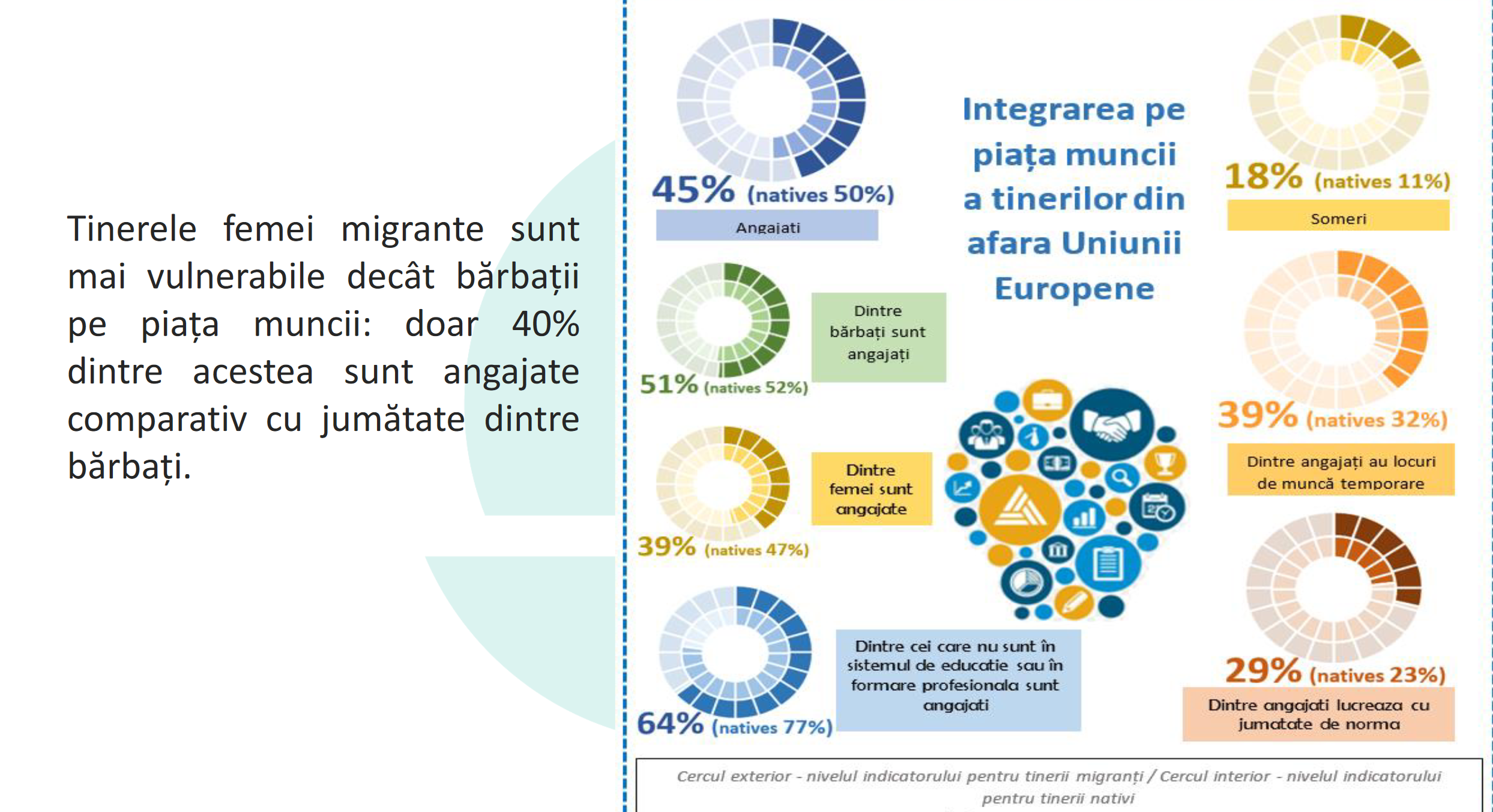 Imigranții constituie o puternică resursă pentru piața muncii, a adăugat profesorul român, reputat specialist și autor a numeroase cercetări pe problema migrației. ”Ei sunt angajați într o proporție foarte mare, apropiată de cea a nativilor. În cazul bărbaților cele două ponderi sunt foarte similare – 51% dintre imigranți și nativi lucrează. Gapul este mai mare în ceea ce privește femeile în care doar 39 la sută dintre imigrante tinere (grupa de vârstă 18-34 de ani) lucrează, față de 47% cele native”, a mai spus Monica Roman..