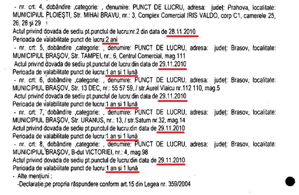 28-29 noiembrie 2010, Silviu Constantinescu încheie contracte de chirie pentru cinci spații comerciale din Ploiești și Brașov. Contractele au durate scurte, 1 an sau 2, și prețuri modice: de la 1,5 lei/mp/lună la 2 euro/mp/lună.