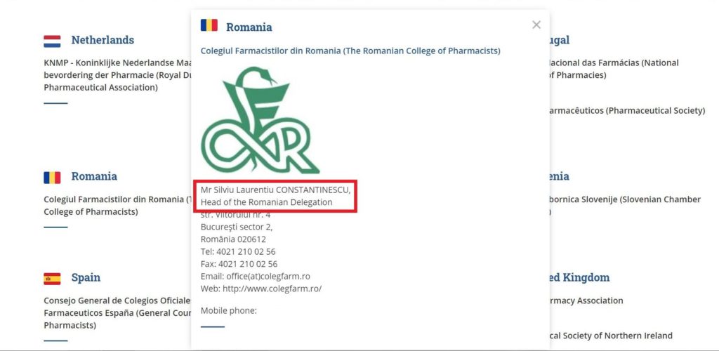În 2011, la doar un an după ce a terminat această „îndepărtată” facultate, Constantinescu – aflat în plin negoț cu autorizațiile de funcționare pe care tocmai le primise de la Minister – a fost numit de Colegiul Farmaciștilor ca reprezentant al breslei române în Grupul Farmaceutic al Uniunii Europene.