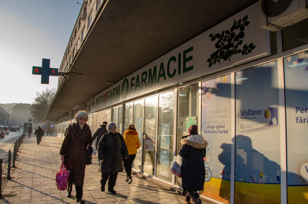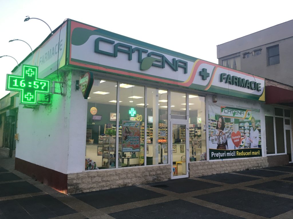 Farmacie din Brașov, deschisă în zona Bisericii Sfântul Bartolomeu, operată printr-o autorizație de funcționare cumpărată de Catena de la Silviu Constantinescu cu 40.000 de euro, în august 2011. FOTO: RISE Project.