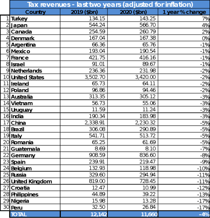 Alte țări au avut parte de variații considerabile în ceea ce privește veniturile fiscale de anul trecut. Exemplul cel mai notabil este Turcia unde veniturile din taxe și impozite au crescut cu 7%. La polul opus se află Filipine care a înregistrat o scădere a veniturilor din taxe și impozite cu 13% în termeni reali, iar în Nigeria, cea mai mare economie din Africa, veniturile fiscale au înregistrat o scădere de 17%. (Cerasela N.).