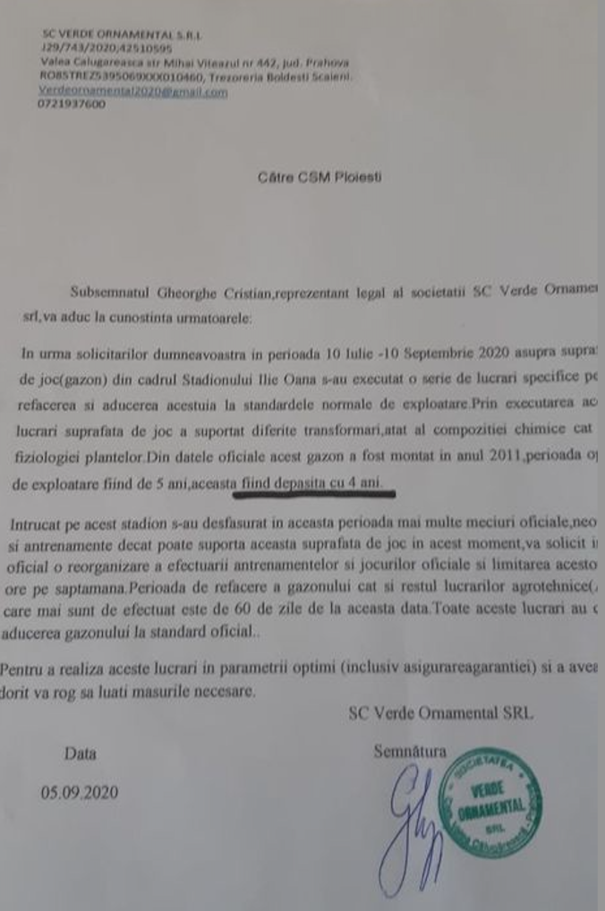 Mai mult, în luna septembrie, reprezentantul Verde Ornament informează conducerea CSM Ploiești că durata de viață a gazonului de pe stadionul ploieștean este expirată de patru ani și că ar trebui înlocuit… Iar în lipsa înlocuirii complete a gazonului, fiecare mentenanță scoate din visteria CSM Ploiești, minim 40.000 de euro anual.