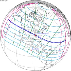 Cu o magnitudine de 1,0306, eclipsa va fi vizibilă de pe un coridor strâmt, peste Statele Unite ale Americii. Cea mai lungă durată a eclipsei totale va fi de 2 minute și 40 de secunde, la 36°58.5′N 87°39.3′V, la Nord-Vest de Hopkinsville, Kentucky.