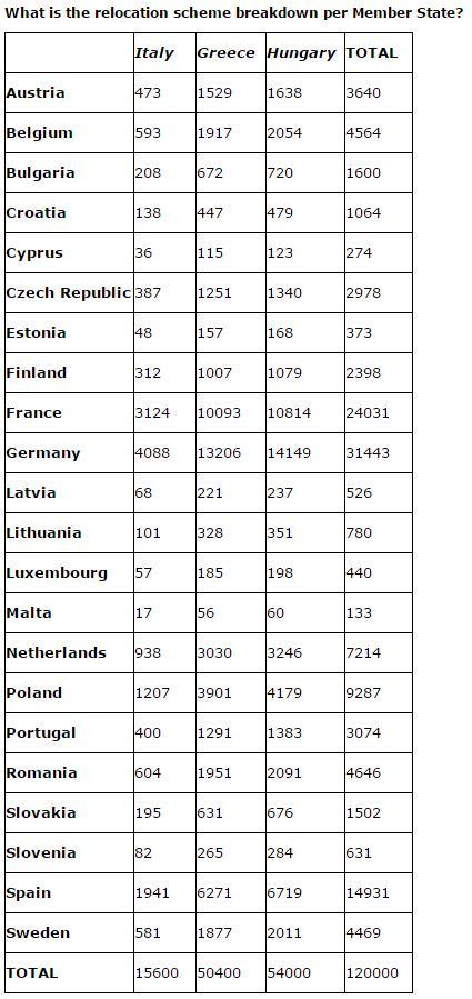 Astfel, potrivit documentului cepoate fi aici accesat, Romania ar trebui sa accepte 4.646 de refugiati. Acestia ar proveni dintre cei care deja se afla pe teritoriul Uniunii – 604 ar veni din Grecia, 1.951 din Italia si 2.091 de la vecinii unguri.