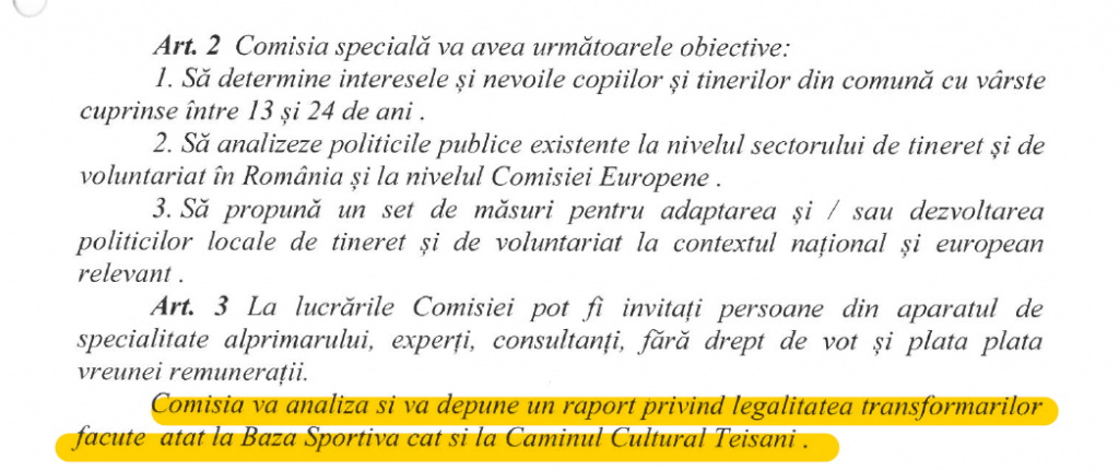 Așa că autoritatea locală a pus la dispoziția ONG-ului, pentru folosire, un alt corp de clădire, parte din Căminul Cultural, în care să înființeze centrul de tineret. În trecut funcționase acolo o grădiniță. A oferit spațiul în baza unui proces verbal de primire-predare, apoi printr-o hotărâre de consiliu local. Tot primăria a permis organizației să folosească un corp de clădire dintr-o bază sportivă a comunei în care să fie amenajat un hostel pentru voluntarii internaționali. Consilierii locali au contestat și asta, printr-un alt proiect de hotărâre de pe 14 septembrie anul acesta.