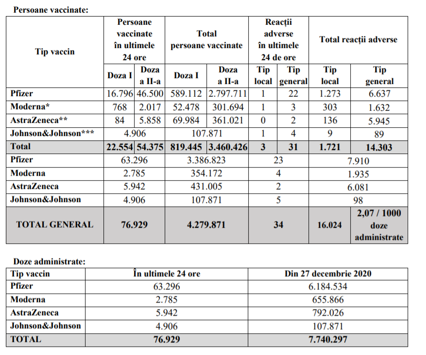 În ultimele 24 de ore, s-au înregistrat 34 de reacții adverse, 23 la Pfizer, 4 la Moderna, 2 la AstraZeneca și 5 la Johnson&Johnson.