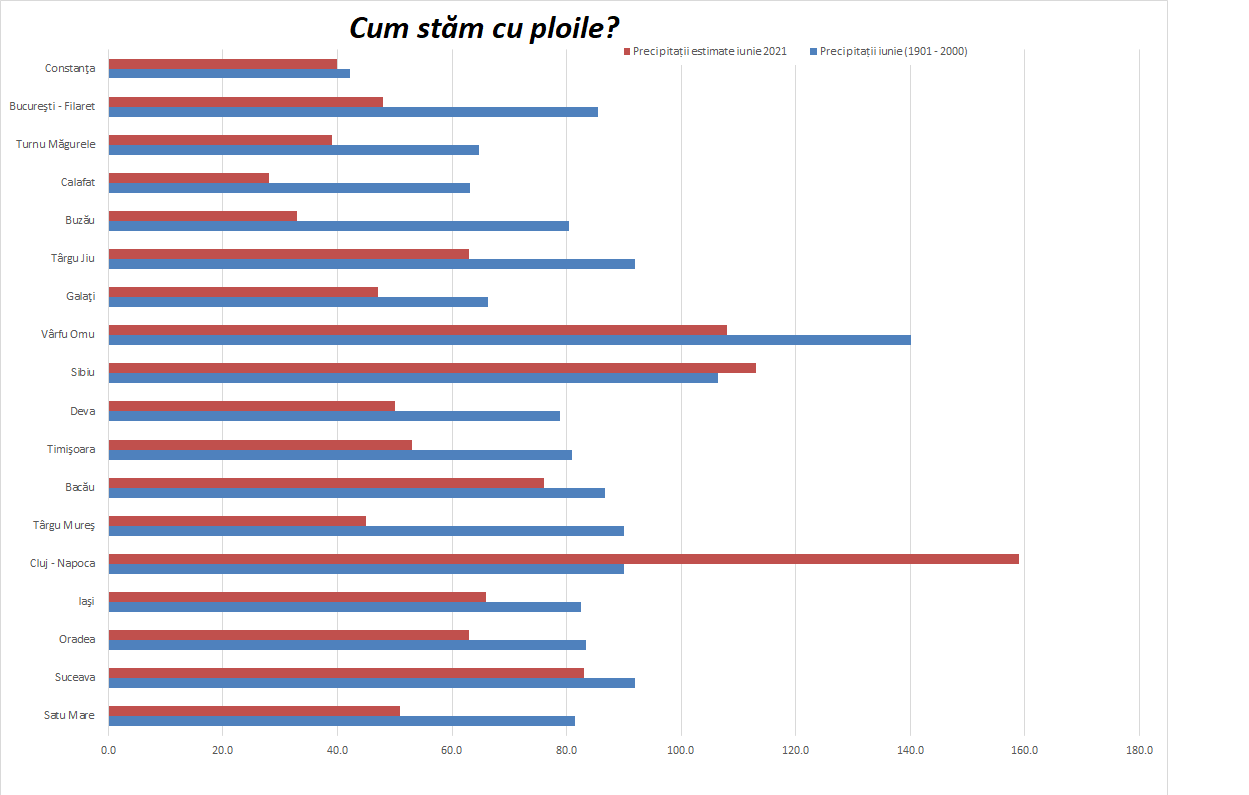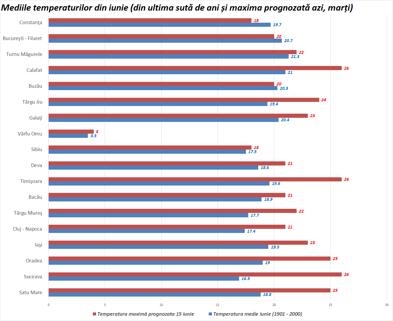 Mai jos, avem datele privind media temperaturilor din ultima sută de ani și temperaturile maxime prognozate pentru marți, 15 iunie 2021: