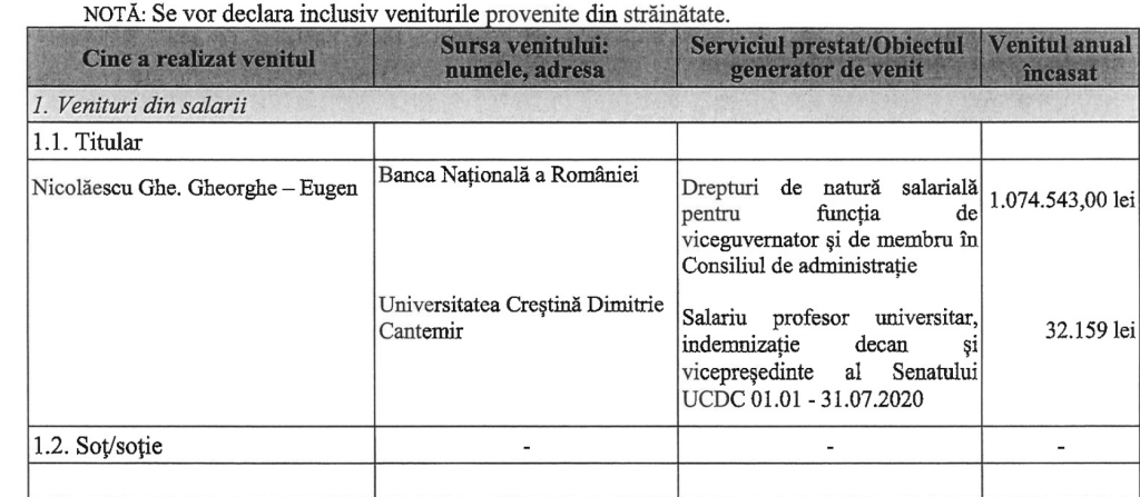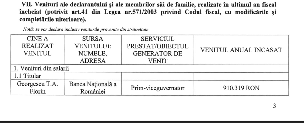 Florin Georgescu, prim-viceguvernatorul BNR, a declarat un salariu de 910.000 lei anul trecut, în scădere față de cel de 1,36 milioane lei din 2019, când a încasat bonusul de pensionare. El a mai raportat și o pensie de 158.000 lei (cu 22.000 lei mai mare decât în 2019), la care se adaugă și o pensie specială de fost parlamentar PSD de peste 100.000 lei. Nu e problema ca se cumuleaza, lui ii convine, voua daca nu va convine, mai stati o tura.