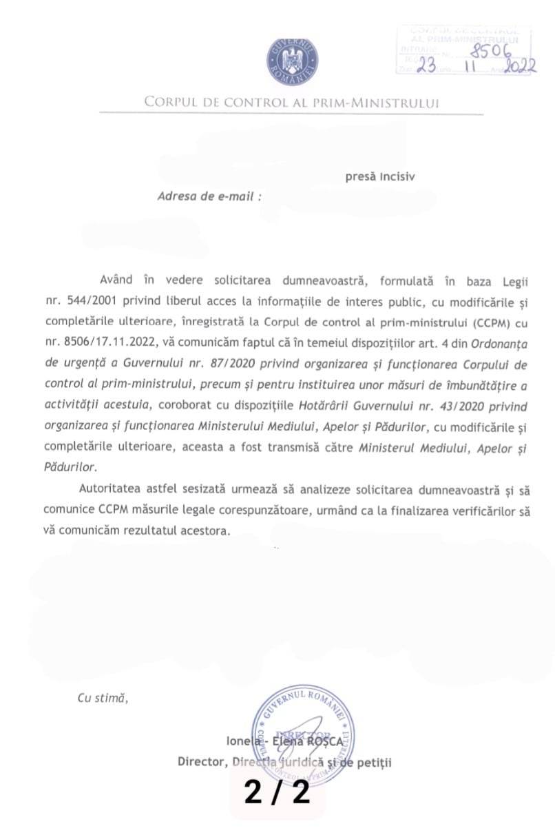 Iata ca, dupa reactia profesionala si rapida a IPJ Prahova, Prim-ministrul României reactioneaza prin Corpul de control al prim-ministrului si sesizeaza MINISTERUL MEDIULUI, APELOR ŞI PĂDURILOR cu privire la „Bomba ecologica de la Pleasa” si atentatul la siguranta nationala.