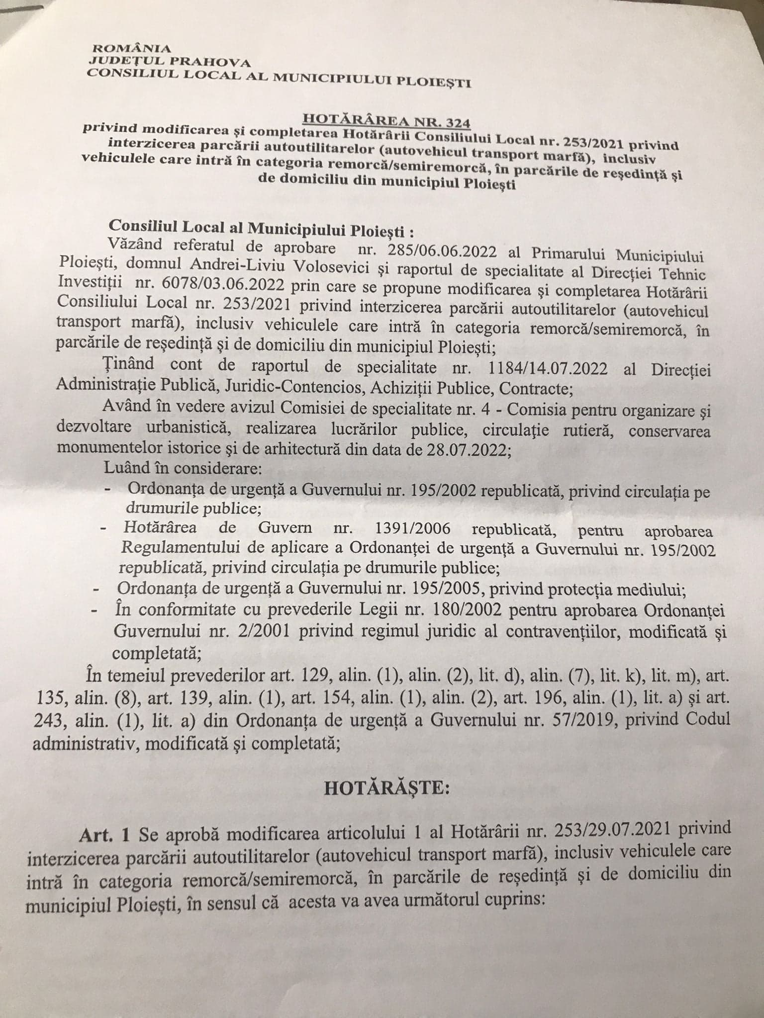 Astfel, in sedinta Consiliului Local al Municipiului Ploiești, mintea odihnita a primarului Andrei Volosevici emana un Referat de aprobare la proiectul de hotarare si completarea Hotararii Consiliului Local nr 253/2021 privind interzicerea parcarii autovehiculelor in parcarile de resedinta si de domiciliu din minicipiul Ploiesti.