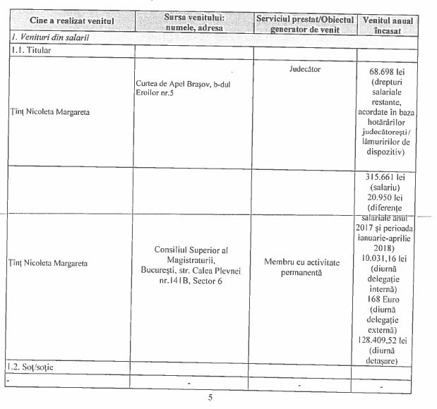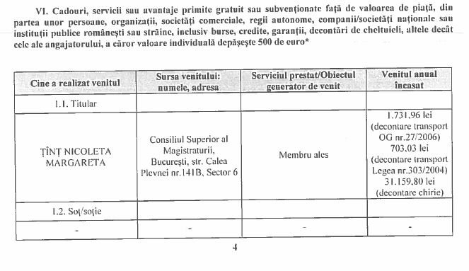 O apărătoare a veniturilor uriaşe ale magistraţilor, ca de altfel majoritatea membrilor CSM, judecătorul Nicoleta Margareta Ţînţ, membru al Secţiei de Judecători a CSM şi preşedinte al CSM în 2020, are potrivit declaraţiei de avere publicate în 2019 venituri din drepturi salariale restante de la Curtea de Apel Braşov, salariu CSM, diferenţe salariale, diurnă CSM delegaţie internă, diurnă CSM delegaţie externă, diurnă CSM detaşare, deconturi CSM transport, decontare CSM chirie în valoare de 10.250 de euro, bani publici, raportat la fiecare lună a anului 2018.