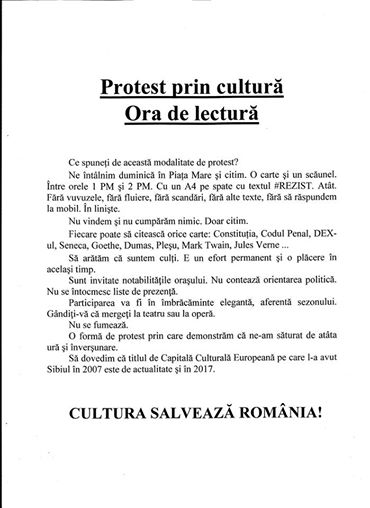 Sibienii care vor ieși la protest în seara zilei de sâmbătă sunt îndemnați să își aducă aportul prin acțiunea de a aduce o carte și de a o lectura. Iar pentru următoarele seri, oamenii sunt îndemnați să vină cu noi idei, care să dinamizeze marșurile.
