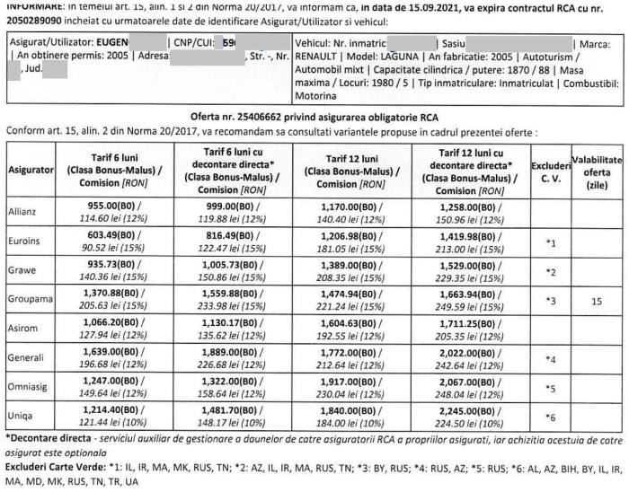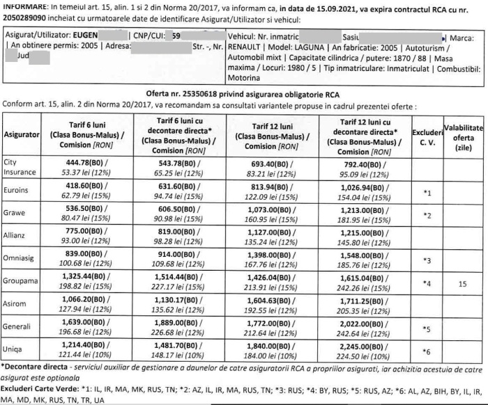 Hotnews publica doua tabele comparative cu oferta pentru aceeasi masina – acelasi sofer primita prin intermediul brokerilor de asigurare. Dupa anunutul ca City Insurance a sifonat banii asiguratilor sub privirea si complicitatea ASF, care a aderat la aceasta sifonare, in doar 10 zile, asiguratorii au scumpit politele RCA, cu zeci de procente. Spre exemplu, Euroins a scumpit de la 418 la 603 lei asigurarea la 6 luni, respectiv cu 44%. Datele obtinute de hotnews arata ca Grawe a scumpit de la 536 la 935 de lei aceeasi asigurare (cu 74% din 3 pana in 15 septembrie). Asta nu este piata functionala! Asta este piata de furt! Ca si la Astra si in cazul City Insurance, problema nu este ca pretul asigurarilor RCA era prea mic! Ci pentru ca sumele se sifonau din societati, in beneficiul grupurilor de interese si in dauna populatiei, cu complicitatea supraveghetorului, care era ,,pacalit” sa nu verifice extrase de cont false ale lui City si astfel nu obligau actionarii sifonari sa aduca capital. Scumpirea asigurarilor cu 44%-74% NU este consecinta cvasi-falimentului City si devoalarii fraudei. Scumpirea asigurarilor este un ESEC de supraveghere, care trebuie corectat astfel: 1. Demiterea intregii conduceri ASF si sesizarea parchetului pentru a determina gradul de complicitate al fiecarui functionar responsabil la lipsa de supraveghere. 2. Autosesizarea Parchetului in privinta pasivitatii conducerii ASF care asista la majorari de preturi de 44%-74% FARA motivatie economica reala. 3. Sesizarea Consiliului Concurentei privind intelegerea la pret de catre ceilalti asiguratori din piata, inclusiv abuzul de pozitie dominanta. In trecut, sub mandatul lui Misu Negritoiu, asa cum am sesizat Parlamentul inca din iarna 2014-2015, asiguratorii s-au mai inteles la pret, fiind amendati cu zeci de milioane de Euro de Consiliul Concurentei. E drept ca acest Consiliu a dat sanctiunea la 3 ani dupa ce eu sesizasem oficial Parlamentul privind inducerea artificiala si nesustenabila de catre Misu Negritoiu a scumpirii asigurarilor, in acelasi scop ca si la City Insurance: actionarii sifonari sa nu aduca capital ci sa acopere sifonarile din scumpiri, dezvaluie analistul Radu Teodor Soviani.