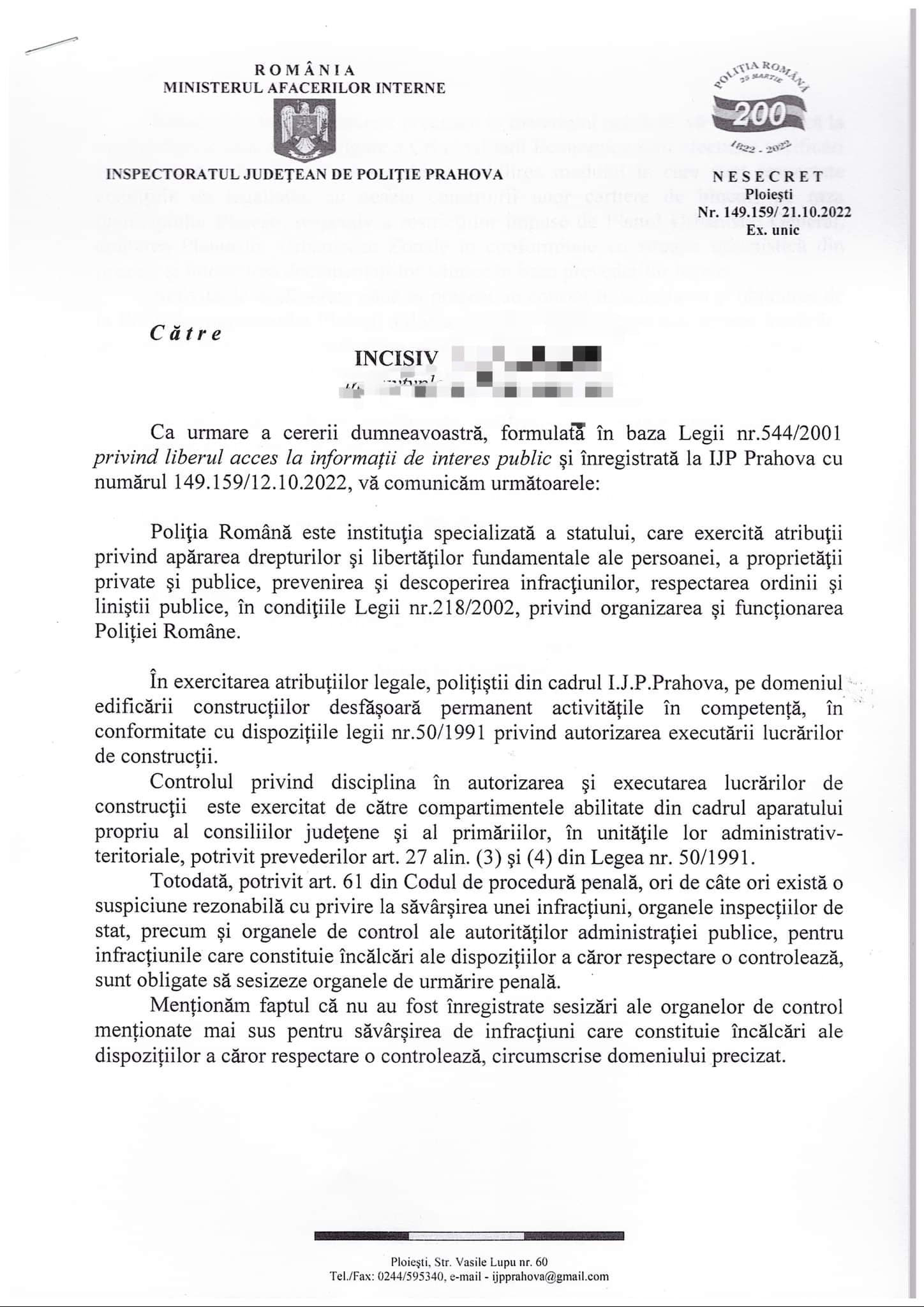 Va dezvaluiam ca, IPJ Prahova ne-a raspuns ca cei de la Serviciul de Investigare a Criminalitatii Economice au efectuat cercetari constand doar in solicitarea si obtinerea de la Primaria municipiului Ploiesti a documentelor depuse pentru autoriozarea lucrarilor de construire.