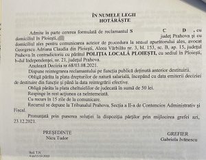 Mai mult, acesta s-a adresat si instantei, in civil, unde – prin Hotarârea 2831/2021 a Tribunalului Prahova care a fost emisa in data de 16.11.2021, o hotarare prin care reclamantul a castigat din nou despăgubiri egale cu salariile indexate, majorate si reactualizate si cu celelalte drepturi de care ar fi beneficiat pe întreagă perioadă de suspendare a contractului individual de muncă si reancadrarea pe postul de functionar public detinut anterior la achizitii din cadrul Politiei Locale Ploiesti.