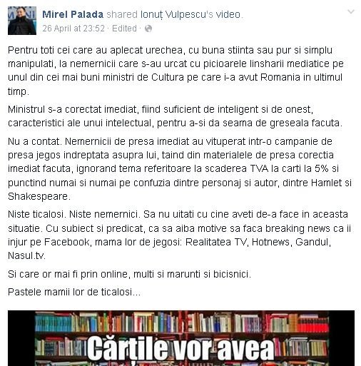 Intr-o postare pe reteaua de socializare Facebook,”elegantul” si „eruditul” domn Mirel Palada ii acuza pe „nemernicii care s-au urcat cu picioarele linsharii mediatice pe unul din cei mai buni ministri de Cultura pe care i-a avut Romania in ultimul timp”, pentru ca n-au tinut cont ca ministrul s-a corectat imediat dupa gafa facuta.