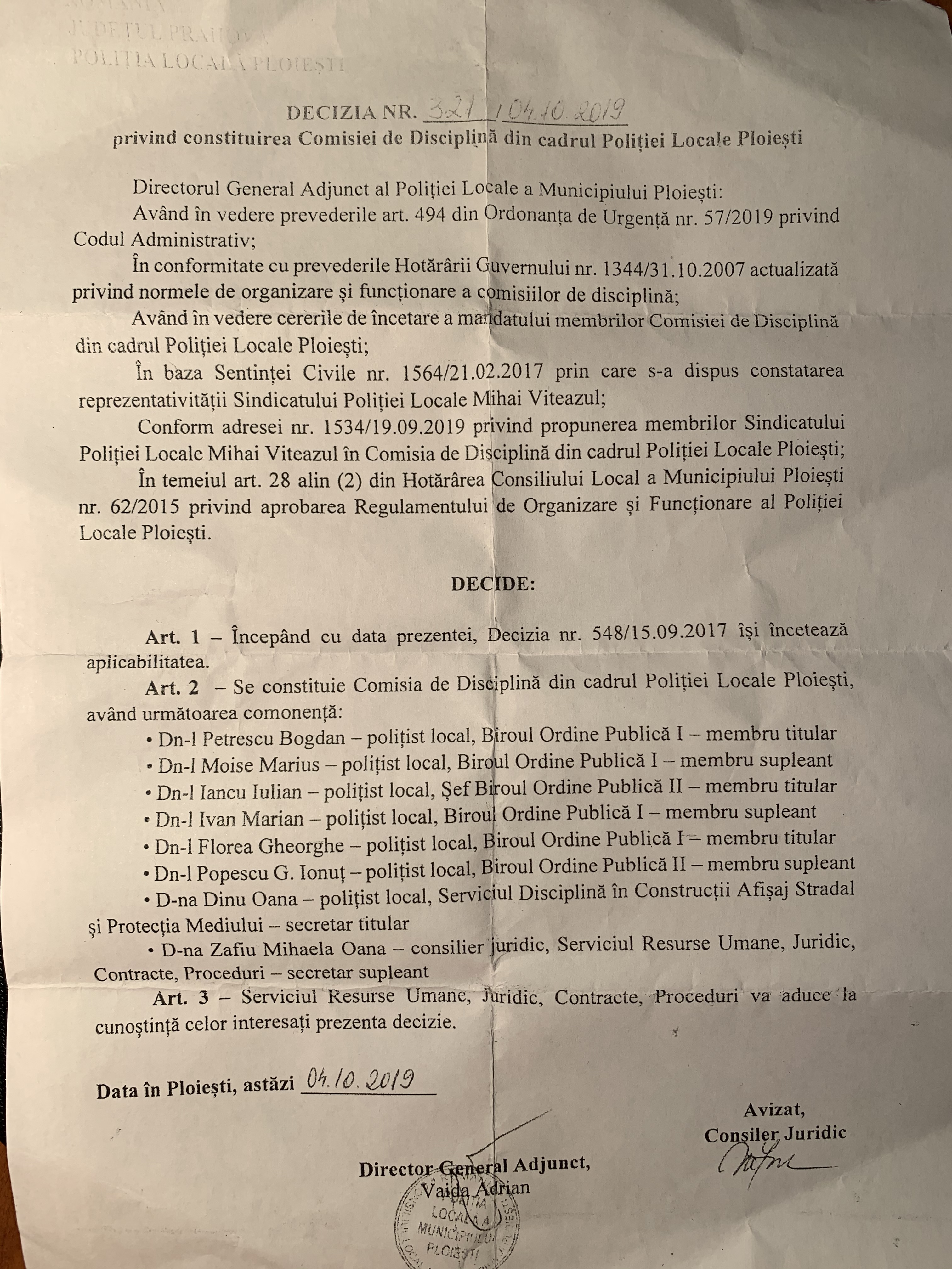Suntem curiosi cum va explica Adrian Vaida organelor de cercetare penala eliminarea membrilor din Comisia de Disciplina constituita legal prin decizia nr 548/15.09.2017, in conformitate cu art 27 alin 2 din HCL 62/2015 privind aprobarea Regulamentului de Organizare si Functionare al Politiei Locale Ploiesti care aveau mandatul in vigoare.