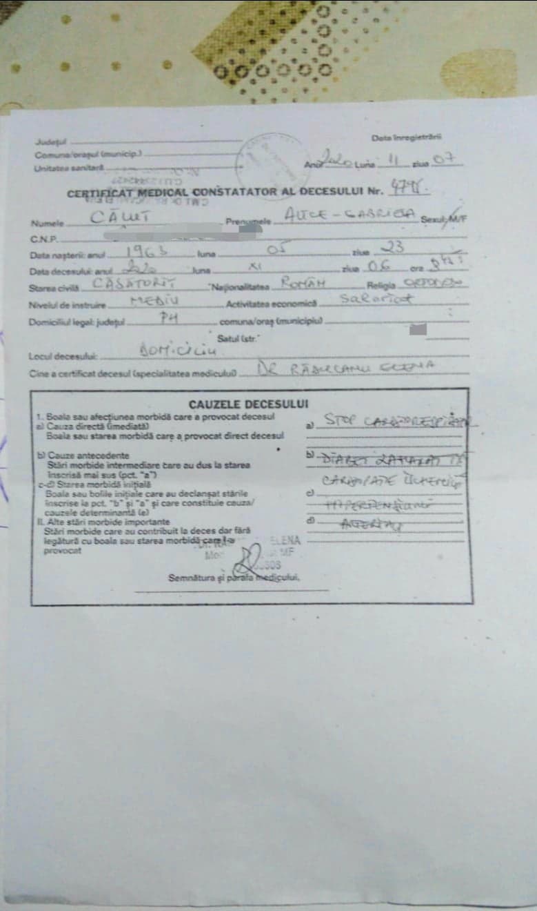 In acest sens s-a emis Certificatul  Constatator de Deces cu cauzele sus mentionate, certificatul nr 4795 din 11.07.2020, certificat emis legal de dr Radulescu Elena.