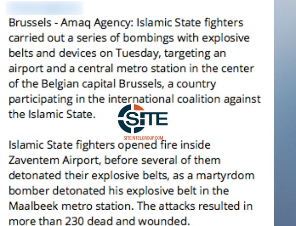 Așa intitulatul Stat Islamic şi-a asumat responsabilitatea pentru atacurile de la Bruxelles, prin intermediul agenţiei Amaq.Teroriştii au afirmat că au ales Belgia ca ţintă din cauza afilierii acesteia la coaliţia îndreptată împotriva Statului Islamic.