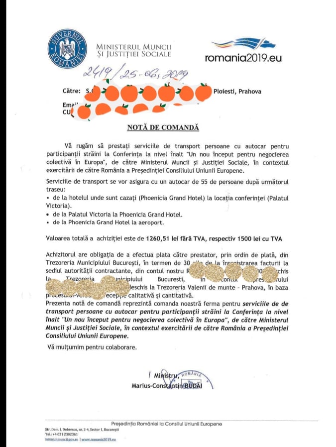 La data de 25.06.2019, prin adresa nr 2419, ministrul de la aceea data de la Ministerul Muncii si Justitiei Sociale, PSD-istul Marius Constantin Budai, emitea catre aceeasi firma „X” de la Cuca Macaii din Prahova o comanda pentru servicii transport persoane cu autocar pentru participantii straini la Conferinta la nivel inalt ” Un nou inceput pentru negocierea colectiva in Europa”, de catre Ministrul Muncii si Justitiei Sociale (adica de el), in contextul exercitarii de catre Romania a Presedintiei Consiliului Uniunii Europene.