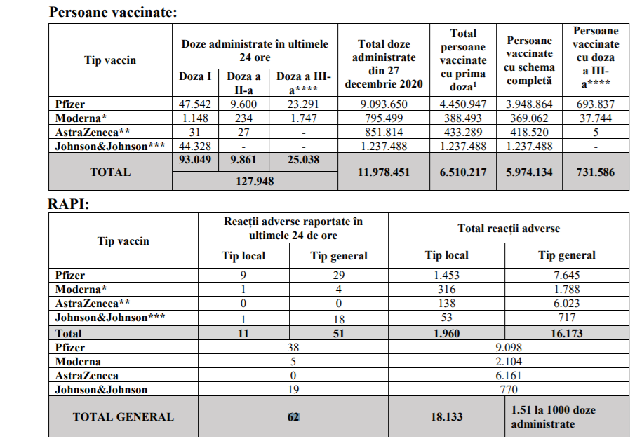 În ultimele 24 de ore, s-au înregistrat 62 de reacții adverse, dintre care 11 de tip local și 51 de tip general. Din cele 62 de reacții advserse, 38 au fost la Pfizer, 5 la Moderna și 19 la Johnson and Johnson.